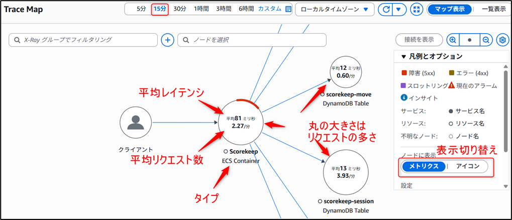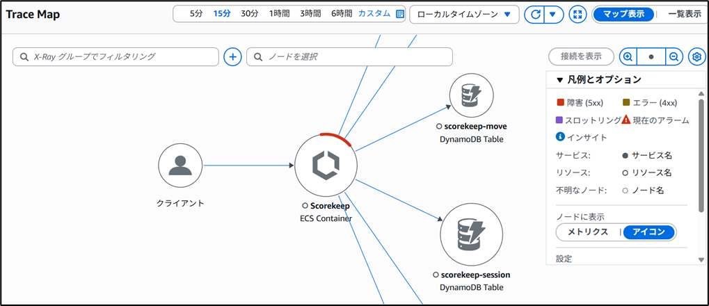以下の図がサービスマップですが、クライアントからのリクエストをECSで受け付けて、そこから更にECSがDynamoDBのAPIを実行していることがわかります。