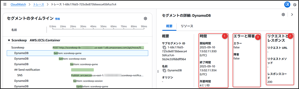 今回の例ではクライアントがECSにリクエストをして、ECSがDynamoDBのAPIを実行したということなのでトレースはECSのセグメントだけです。(DynamoDBはセグメントを送らないようです)