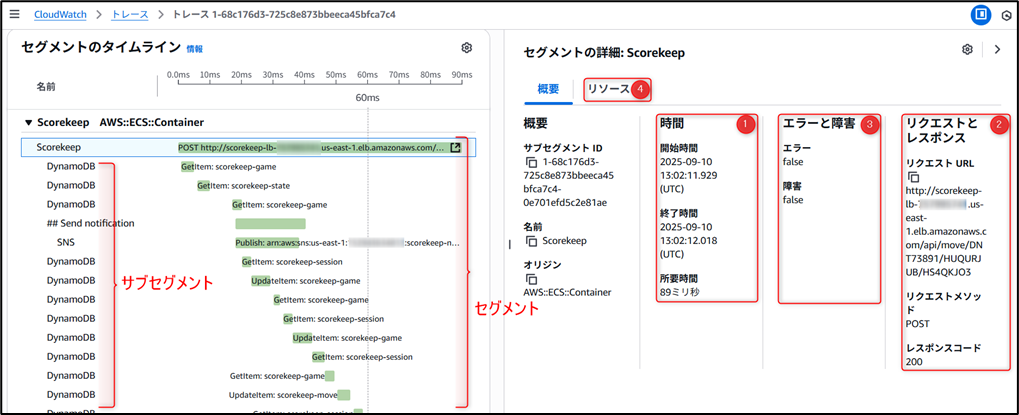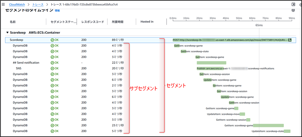 例えば先ほどのセグメントは『ECS がクライアントからリクエストを受け取ってレスポンスを返した』という全体の処理を表しています。