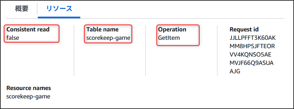 [リソース]タブ:キャプチャはDynamoDBの例ですが、テーブルネーム、操作(GetItem)、Consistent read(強力な整合性のある読み込みかどうか)の情報があります。ここに示される情報はサービスによって違います。