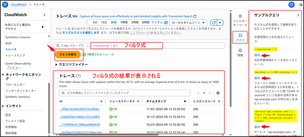 例えば以下のキャプチャでは、responsetime (応答時間)が0.1秒以上のトレースを検索し、結果として7件のトレースがヒットしていることが分かります。