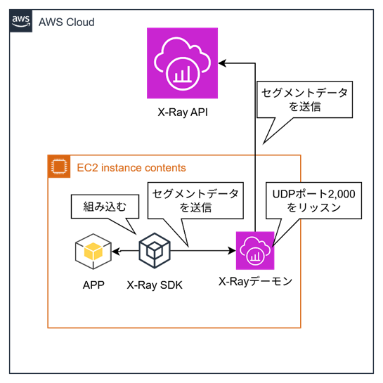 X-RayデーモンはUDPポート2,000をリッスンし、未加工のセグメントデータをX-Ray APIに送信するアプリケーションソフトウェアです。